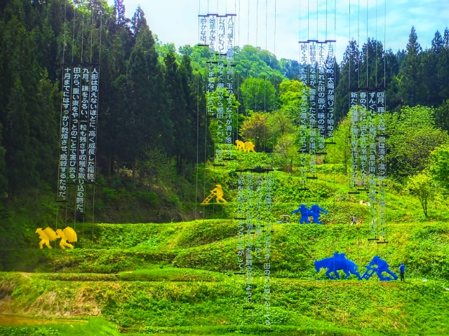 農舞台から外を見ると、白い枠に吊るされた文字。その向こうの棚田には、青と黄色のヒトガタが並んでいます。