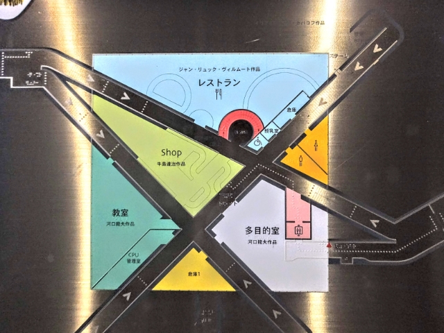 四角い建物ですが、エスカレーターと通路が斜めに走っているため、内部は少し複雑に感じます。