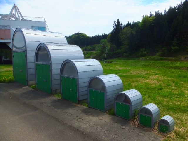 こちらの並んだ倉庫も《かまぼこアートセンター》by 小沢剛というアート作品。豪雪地帯である越後妻有地域では、このようなアーチ型のかまぼこ型が一般的な倉庫のカタチなのです。