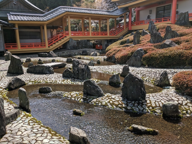 庭園はここだけではありません。少し離れたところ、お蕎麦やぜんざいを扱う「休憩所 団ぷ鈴」の裏にも「蓬莱の庭」という庭園があり、拝観券で見学することができます。ここは不老不死の仙界を意味する蓬莱をイメージしたという庭園。鎌倉時代の回遊式庭園を取り入れた庭で、リアル神使である亀と鯉が悠々と泳いでいました。