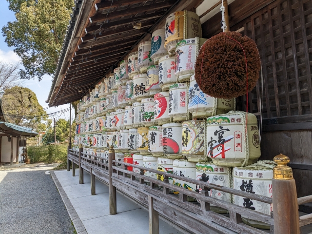 狂言「福の神」において松尾神は神々の酒奉行として登場するそう。そのため酒造関係者から信仰されるようになり、境内には奉納されたたくさんの酒樽を見ることができます。菊正宗、黄桜、月桂冠、鬼ころし・・・。誰でも一度は見たことあるような著名なお酒の銘柄の名前が並びます。