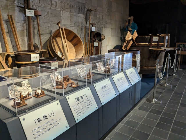 境内にはお酒の資料館も設置されており、無料で見学できます。軒先に見える「杉玉」は、造り酒屋が新酒ができたことを知らせるために吊り下げていたものです。