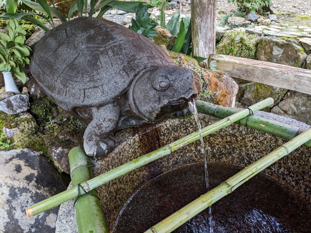 松風苑のすぐ側には「亀の井」があり、こちらは無料で見学可能。この井戸は松尾山からの湧水の泉。水が出るところは亀の姿をしておりますが、この亀が1mくらいと大型。まるでゾウガメみたいな姿です。