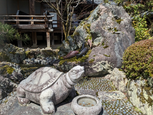 この松尾大社の神使は、「鯉(コイ)」と「亀」。神使の庭と呼ばれる一角には、手前に亀、奥の岩には鯉の彫刻が置かれています。鯉は滝を登る姿が勇ましいです。