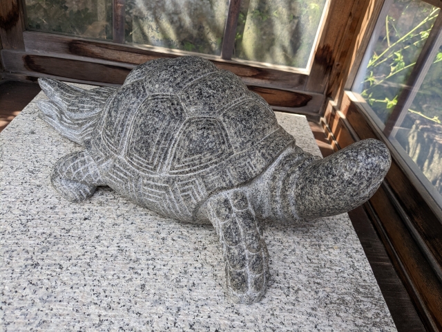 拝殿向かって左には幸運の撫で亀。寿命長久、家庭円満の御利益があるそうで、撫でられすぎてつやつやです。