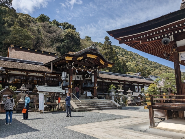 屋根が流れるように伸びる「流造」という建築様式で造られていますが、通常の流造は前方部分のみが流れているのに対して、この松尾大社は前後が同じ長さに流れています。これは「両流造」とも「松尾造」とも呼ばれる、独自の建築様式。