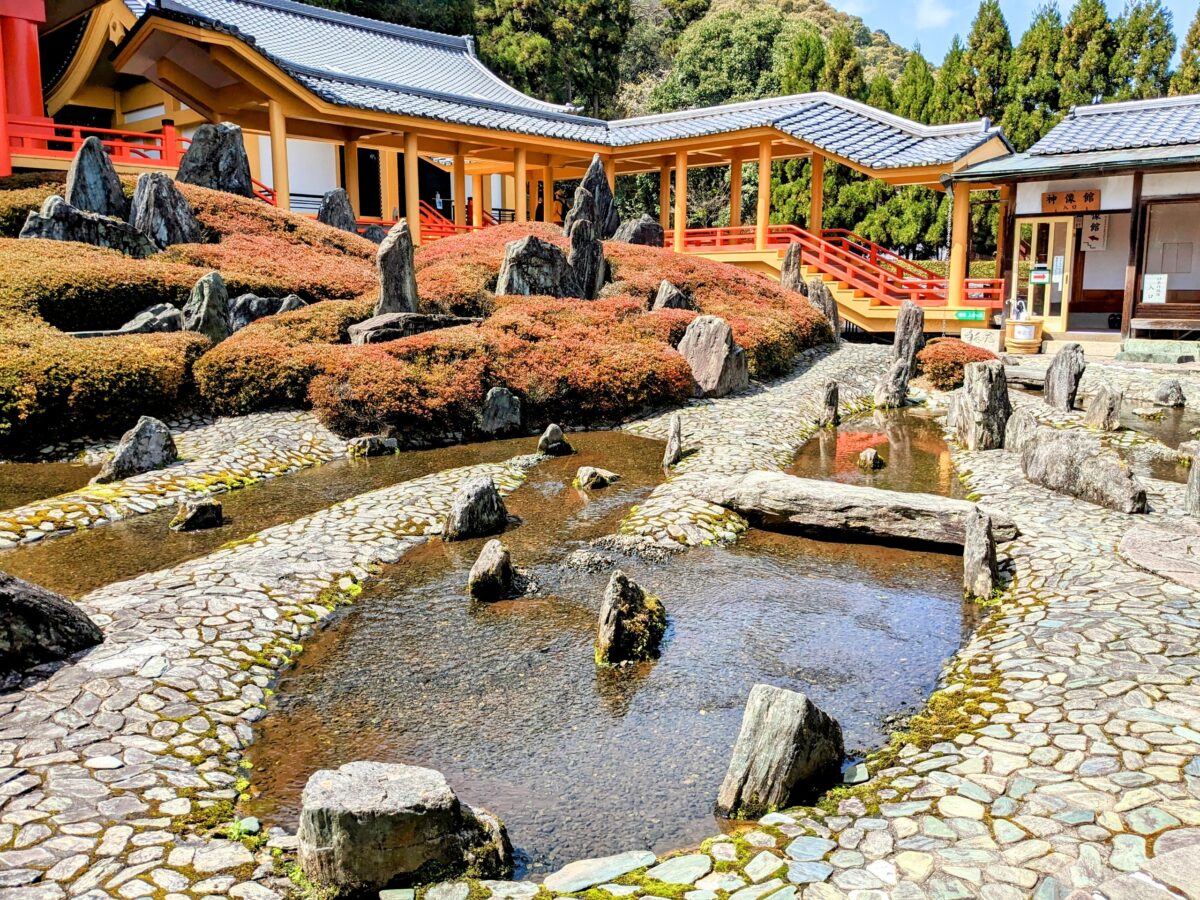 庭園はここだけではありません。少し離れたところ、お蕎麦やぜんざいを扱う「休憩所 団ぷ鈴」の裏にも「蓬莱の庭」という庭園があり、拝観券で見学することができます。ここは不老不死の仙界を意味する蓬莱をイメージしたという庭園。鎌倉時代の回遊式庭園を取り入れた庭で、リアル神使である亀と鯉が悠々と泳いでいました。
