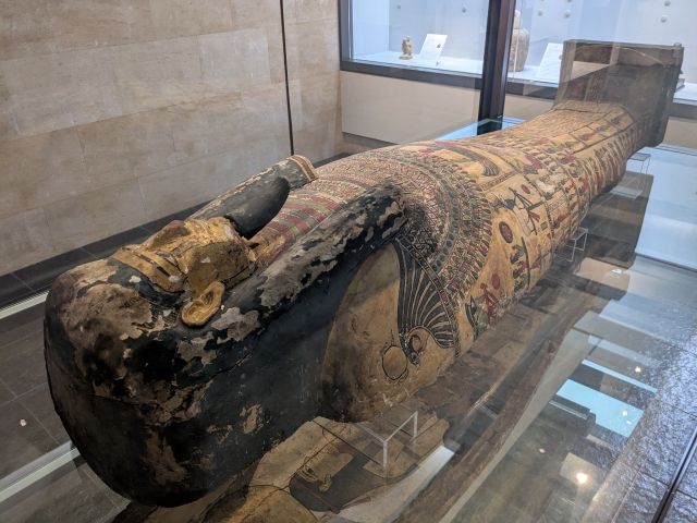 横たわるのは古代エジプトの彩色木棺。金色に染められた顔面、身体にびっしりと描かれた獣の頭部を持つ神々の姿など、細部まで見応えたっぷり。上下のパーツが開いた状態で展示されているため、内部に描かれた絵も見ることができます。