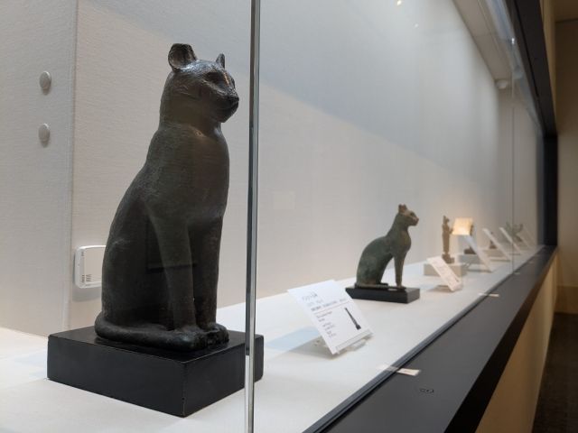 ずらりと並んでいるのは古代エジプトの彫刻作品。聖牛アピス、ネコの姿をしたバステト、ライオンの頭を持つセクトメ、ハヤブサの姿のホルスなど、神として崇められた動物たちが揃っています。