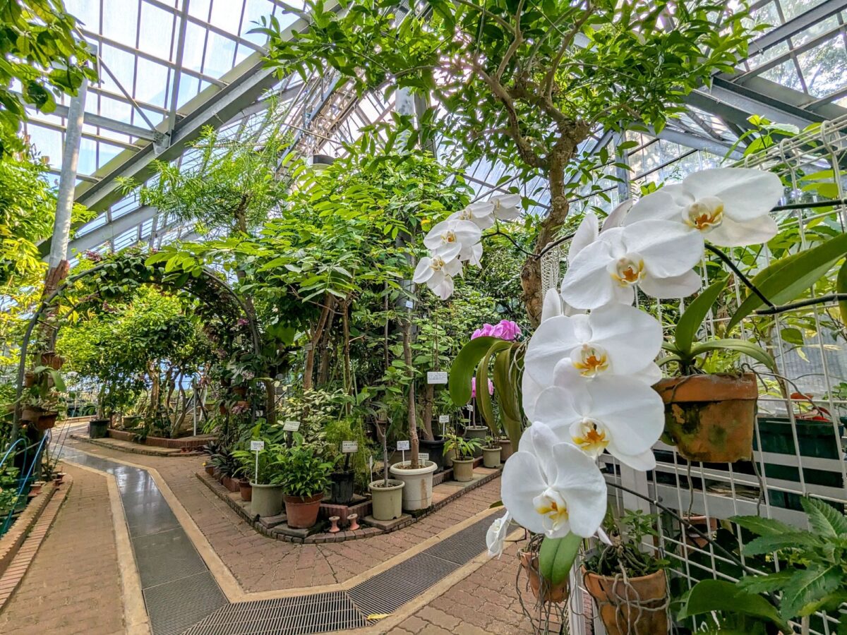 入口付近には建つのは熱帯温室。熱帯性の華やかな植物や巨大な葉を持つ植物など、個性的なラインナップがそろっています。