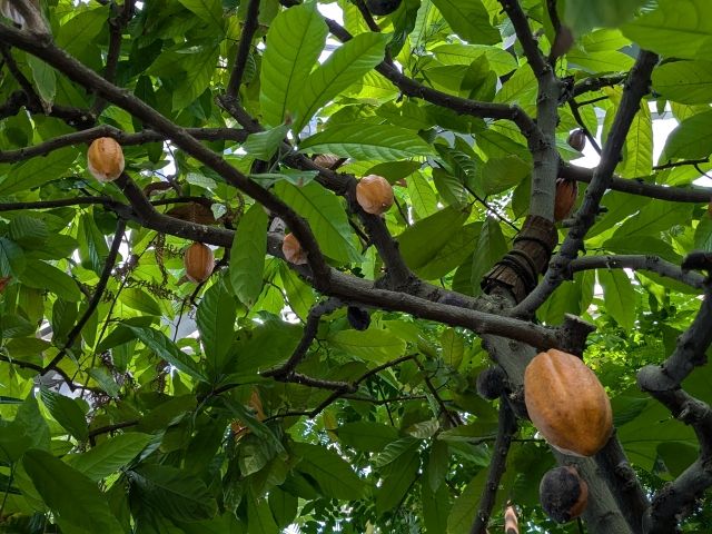 訪問した際はカカオの果実が実っていました。果実が成熟したのち、中の種子を取り出して発酵させるとカカオ豆に、それをローストしてすりつぶし、砂糖・ミルク・香料などを加えて固めるとチョコレートが完成します。