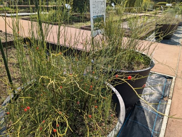 「漢方植物区」でみかけたマオウ。トクサのような節のある低木で、小さな赤い花がとってもかわいらしい。麻黄湯、葛根湯などに処方されるそうです。