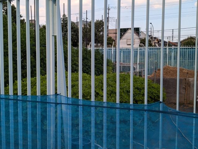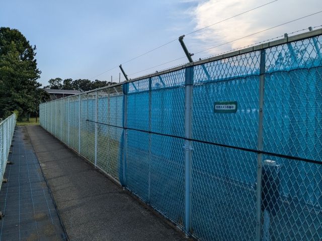 そんな園内を歩いていると、青いシートに包まれた区画が。二重のフェンスに覆われており、「監視カメラ作動中」の記載も。物々しい雰囲気です。