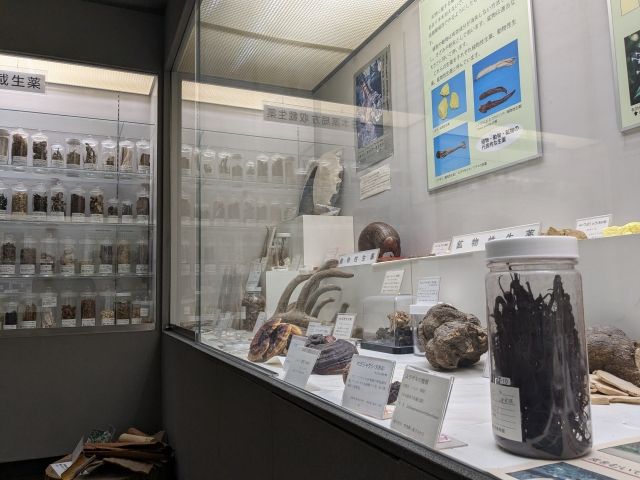 ずらりと並ぶ生薬。植物由来のものだけでなく、動物性のものも。原料となるセンザンコウの剥製や鹿の角、ヨウジウオの標本なども並んでいました。