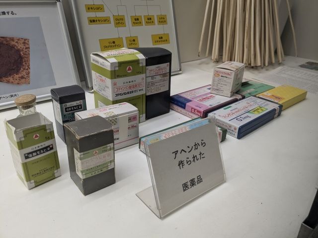 アヘンから作られた医薬品も展示されています。モルヒネ、コデインリン酸など、意外と馴染みあるものも。思ったより身近な存在というのが驚きです・・・!