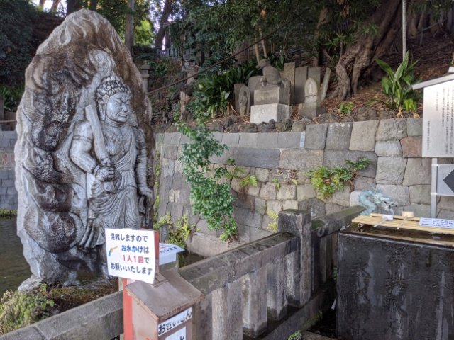 池の中に立っているのは水かけ不動明王。柄杓で水をかけてお参りするそう。江戸時代にはこの滝を浴びると病気が治ると信仰されておりましたが、現代ではこの不動明王が人々の代わりに水垢離をしてくださります。