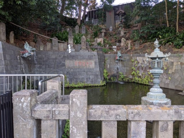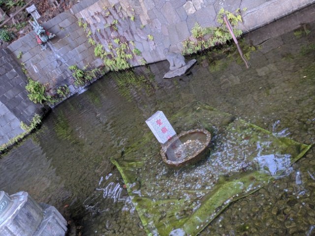 瀧から広がる池には、水中に沈んだお賽銭入れ。10円玉を投げてみたらわりと簡単に入りました!賽銭入れに入らずまわりに落ちているのは一円玉ばかり。どうやら投げる硬貨の重さで難易度が変わるようです。