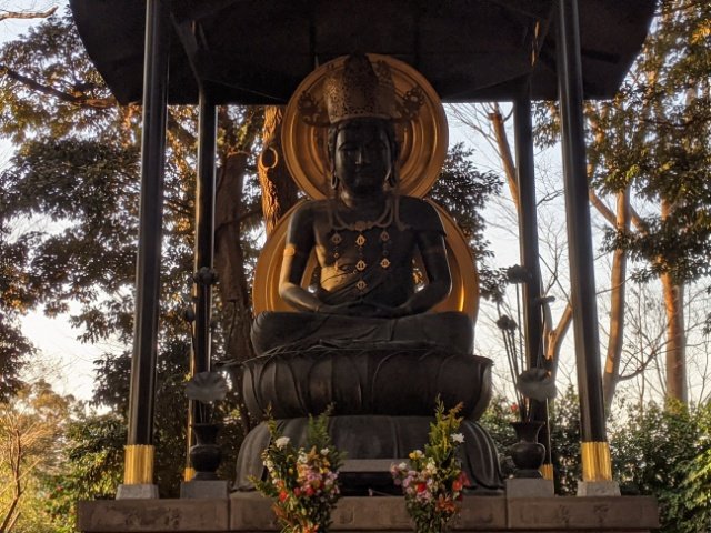 大本堂の裏手には高さ385cmの大きな銅製の大日如来像。大日如来は、密教の中で最高の位の仏様。宇宙そのものであるというとてもスケールの大きい存在です。