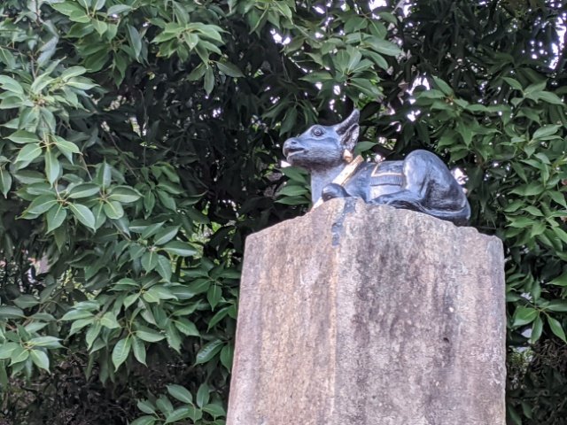 本堂向かって右側、虚空菩薩像の隣にある石柱の上には黒いウシ。天神様や善光寺にいる撫で牛のような姿ですが、とても触れる位置ではありません。