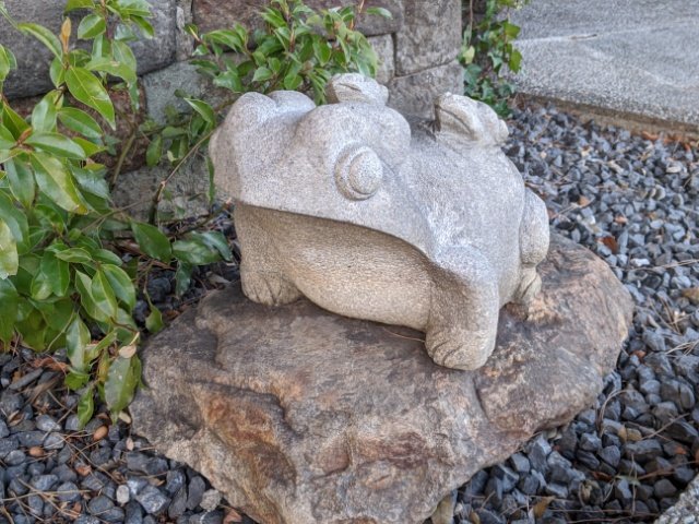 本堂へ向かう石段手前の右側にはカエルの石像。背中に2匹の子ガエルを乗せています。ついつい子ガエルと書いてしまいましたが、カエルの子供はオタマジャクシなので、背中に乗っているのは子供ではなく小さなオトナでしょうか・・・?