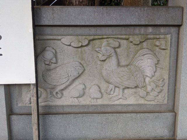 カエルの上にはニワトリのレリーフ。こちらは雄鶏と雌鶏のつがい。足もとには3匹のヒヨコが。