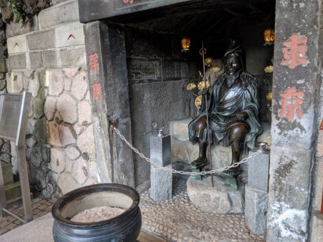 女坂の祠には、腰かけた役の行者倚像。役行者(えんのぎょうじゃ)というのは、奈良時代に修験道を開いた人物。高下駄を履き、錫杖を手に持ち木の葉をまとった姿は、まるで天狗のような風格です。