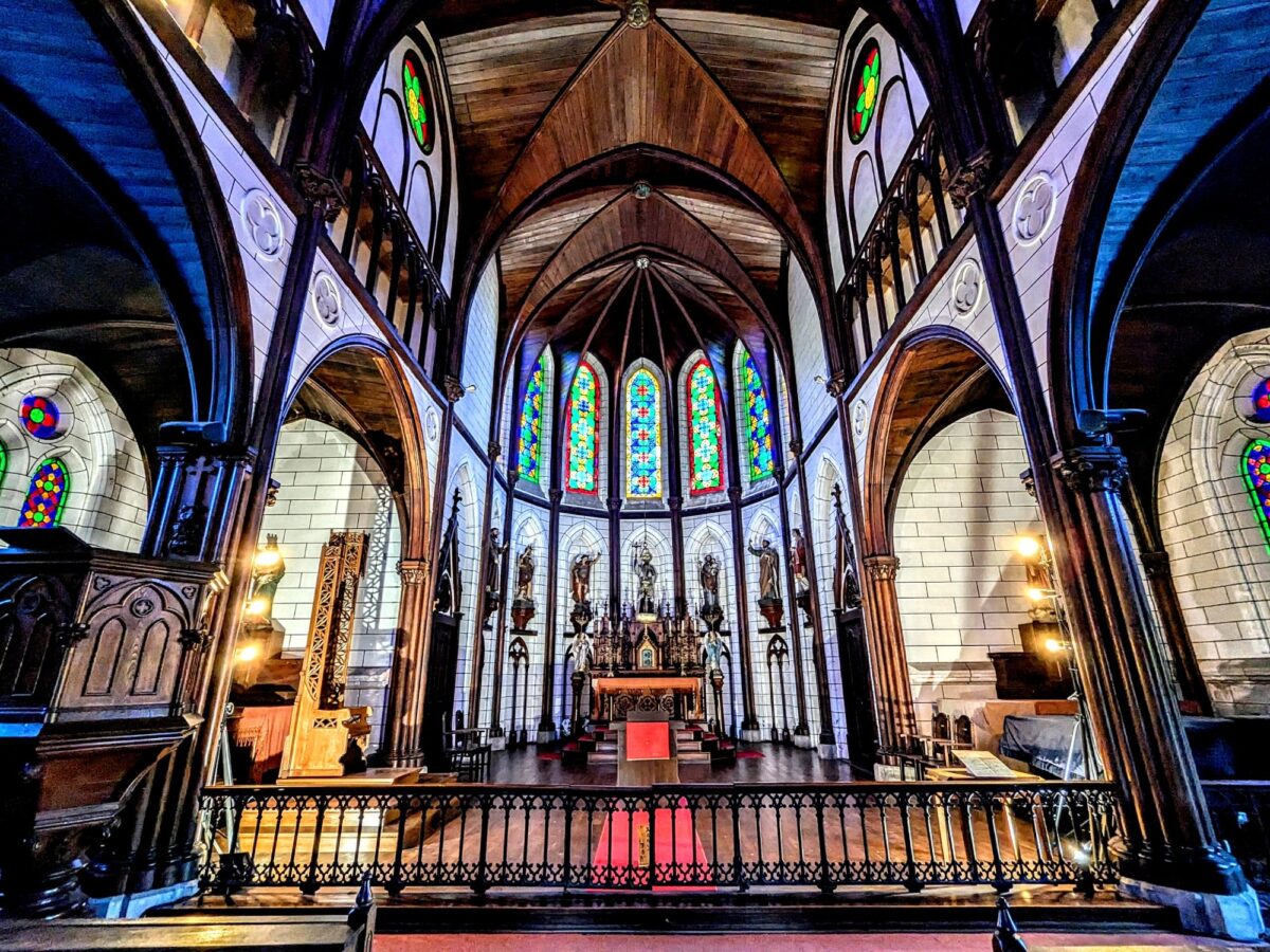 美しい白亜の外観はもちろんのこと、内部もとっても華やか。色鮮やかなステンドグラスは美しく、特に「薔薇窓」と呼ばれる円形の窓に目を奪われます。