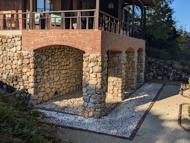 ずっしりとした石垣の柱には、レンガでアーチが組まれています。このスペースは何か用途があるのでしょうかね。