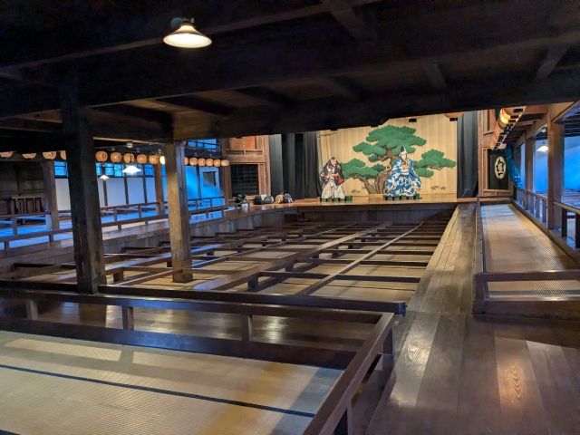 内部には立派な松が描かれた舞台が。1階の土間席や2階の桟敷席、さらには奈落などの舞台装置もあります。