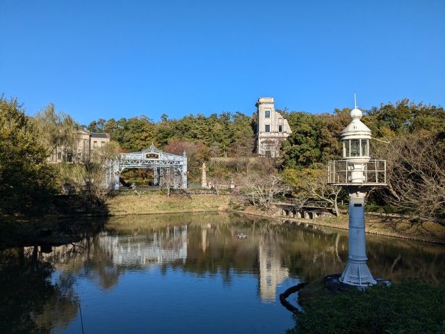 明治村のすぐそばにあるのが入鹿池という溜池。そんな池のほとりに立っているのが「29. 品川燈台」。明治3年に品川沖の第ニ台場に建てられた灯台です。