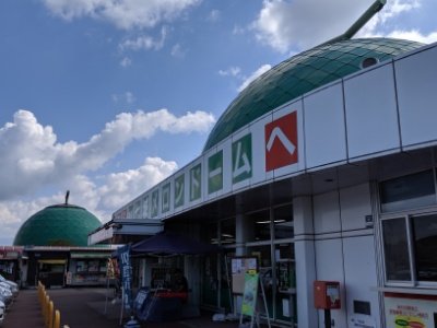 こちらは道の駅・七城(しちじょう)メロンドーム。3つのメロンのうち2つが道の駅の物産館、1つはトイレになっています。