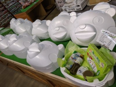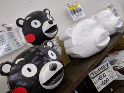 並べられた真っ白なくまもん。こちらはスチロールの保冷ボックス。購入した商品を入れて持ち帰ったり配送したりするのに仕様するケースだそう。