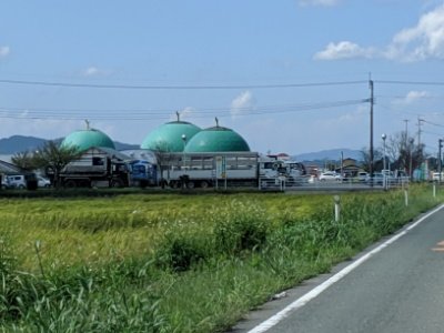 熊本県の北部・菊池市七城町の田んぼの真ん中に突如現れる3つの緑色の球体。まるでガスタンクのようですが、よく見るとメロン!