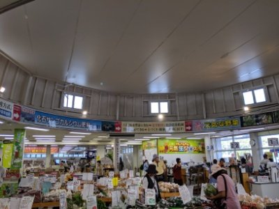内部は道の駅らしく農産物やお土産が並んでいます。目立つのはやっぱりメロンケーキやメロンカステラ、メロンラングドシャ、メロンわらびもちなどのメロン関連商品。お菓子だけでなく、メロンそうめん、メロンドレッシングなどの味の想像がつかない攻めたラインナップも。