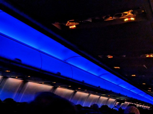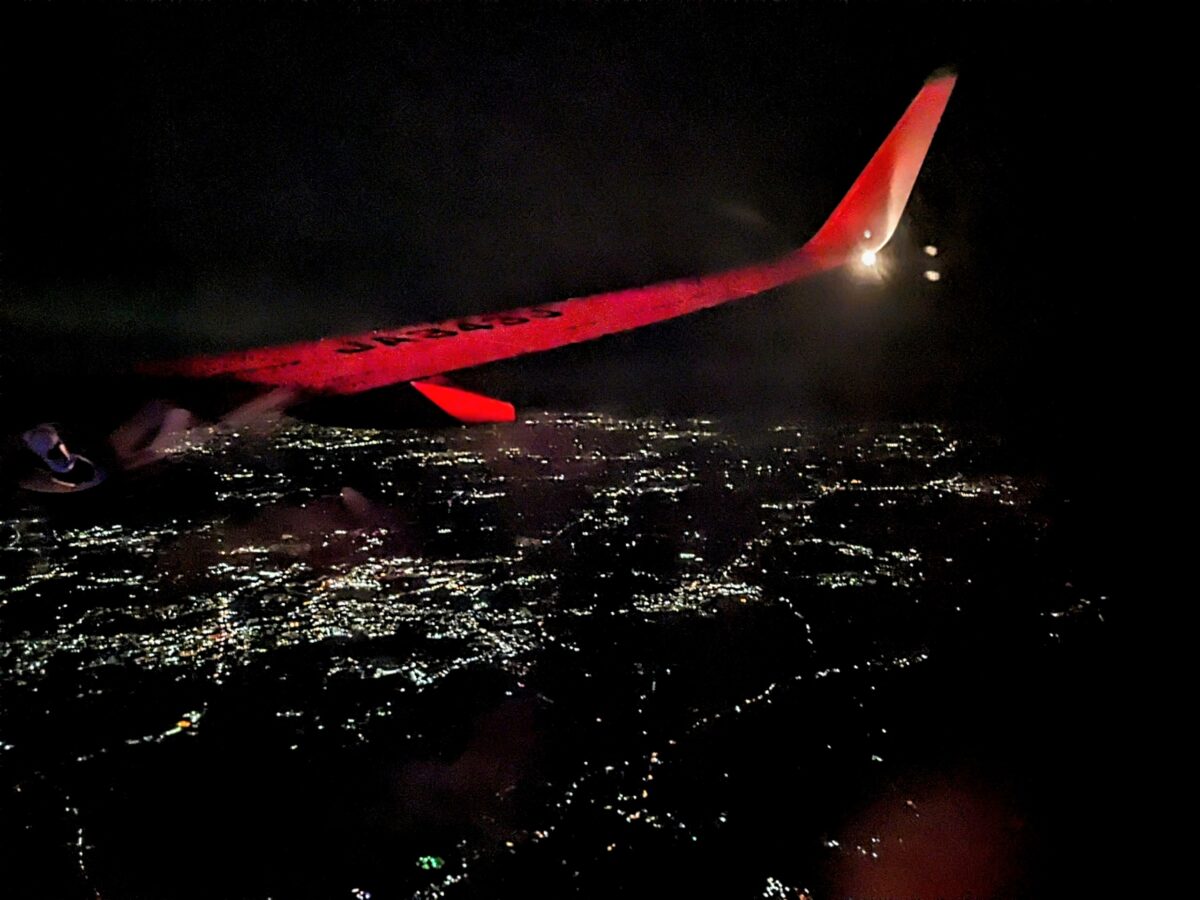 20:10の便に搭乗予定でしたが、5分遅れて20:15発に。機内照明を落とした飛行機は、夜景が輝く街の上空を高く飛び立っていきます。