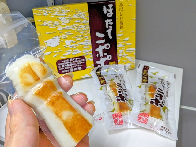 網走北都というお店の限定商品。二ポポというアイヌの工芸品のカタチをしたかまぼこで、中にはホタテが入っています。5個入り箱、10個入り箱に加えて、バラ売りもしています。そのままでも食べられるので、帰りのフライトのお供にもぴったりです。