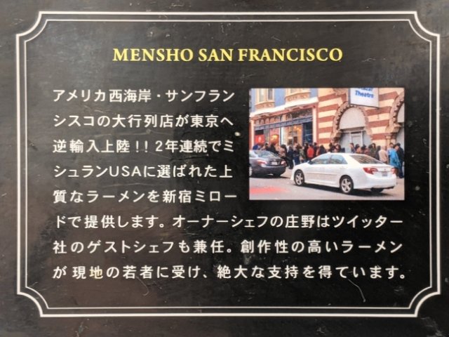 調べてみたところ「麺匠」というラーメン店がサンフランシスコに出店したお店を日本に逆輸入したのがMENSHO SAN FRANCISCOとのこと。