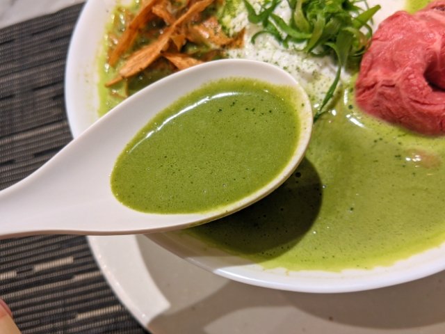 さて、気になるお味ですが、さっぱりとした鶏白湯味!見た目通りクリーミーで、とっても美味しい!抹茶の風味もばっちりと感じます。天ぷらなどで見る抹茶塩のおかげで、しょっぱい抹茶もすんなりと受け入れられましたが、スイーツやアイスでしか抹茶を食べていない方は、かなり違和感を覚えそうです。