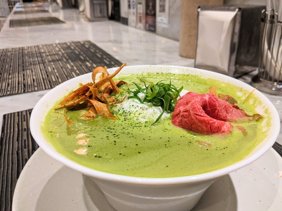 カウンターに座り食券を出すと、すぐにグリーンに染まったラーメン「抹茶鶏白湯」がやってきました!