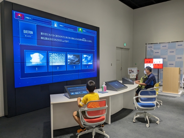 「ウェザーミッション」では、気象庁の新人予報官となって天気予報の仕事を体感できます。モニターから案内してくれる予報官の方がとっても面白いです。見ていると、なぜかカレーが食べたくなるのでご注意ください・・・!