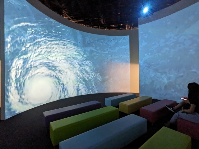 360°にスクリーンが広がる「うずまきシアター」。美しい自然の映像や気象現象のメカニズム、日本の四季、はれるんウェザーアドベンチャーなど様々な映像が随時流れています。
