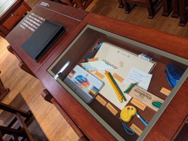 各机には、戦後から続く各年代の教育が記されています。解説文とともにその時代の文房具も並んでいるのですが、これがとっても楽しい!フエキ糊やくねくね鉛筆、学習帳など懐かしいものがそろってます。2000年代以降は「防犯ブザー」が加わっていたりと、時代を反映したセレクトに社会の変遷を感じます。