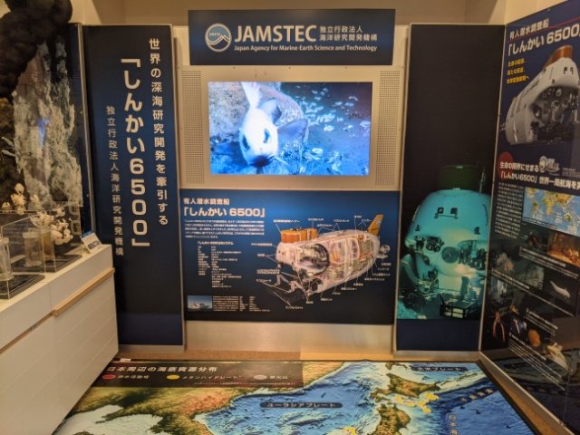 世界の深海調査を行っている有人潜水調査船・しんかい6500に関する展示も豊富。1/15の模型や、覗き窓の実物、そして実際にしんかい6500によって撮影されたドキドキの深海映像も。
