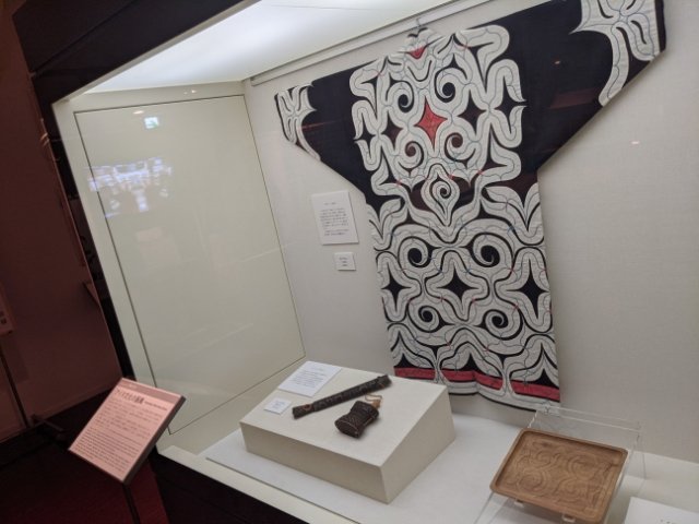 文部科学省はアイヌ文化を支援しており、衣服や道具も数点展示されています。モニターでは、2020年7月に北海道にオープンした民族共生象徴空間ウポポイの紹介映像も流れています。
