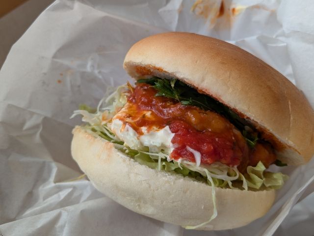 バンズには水菜、キャベツ、トマト、そしてナマズ肉のパティが入っています。味付けはトマトソースなのでさっぱり。