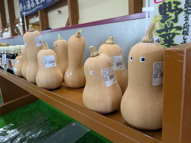 どうみてもひょうたんですが、こちらは「バターナツッツ」というカボチャ。ナッツのような甘さが特徴的とのことですが、どんな風味なのかとっても気になります。最近はいろんなとこほで見かけるようになりましたね。