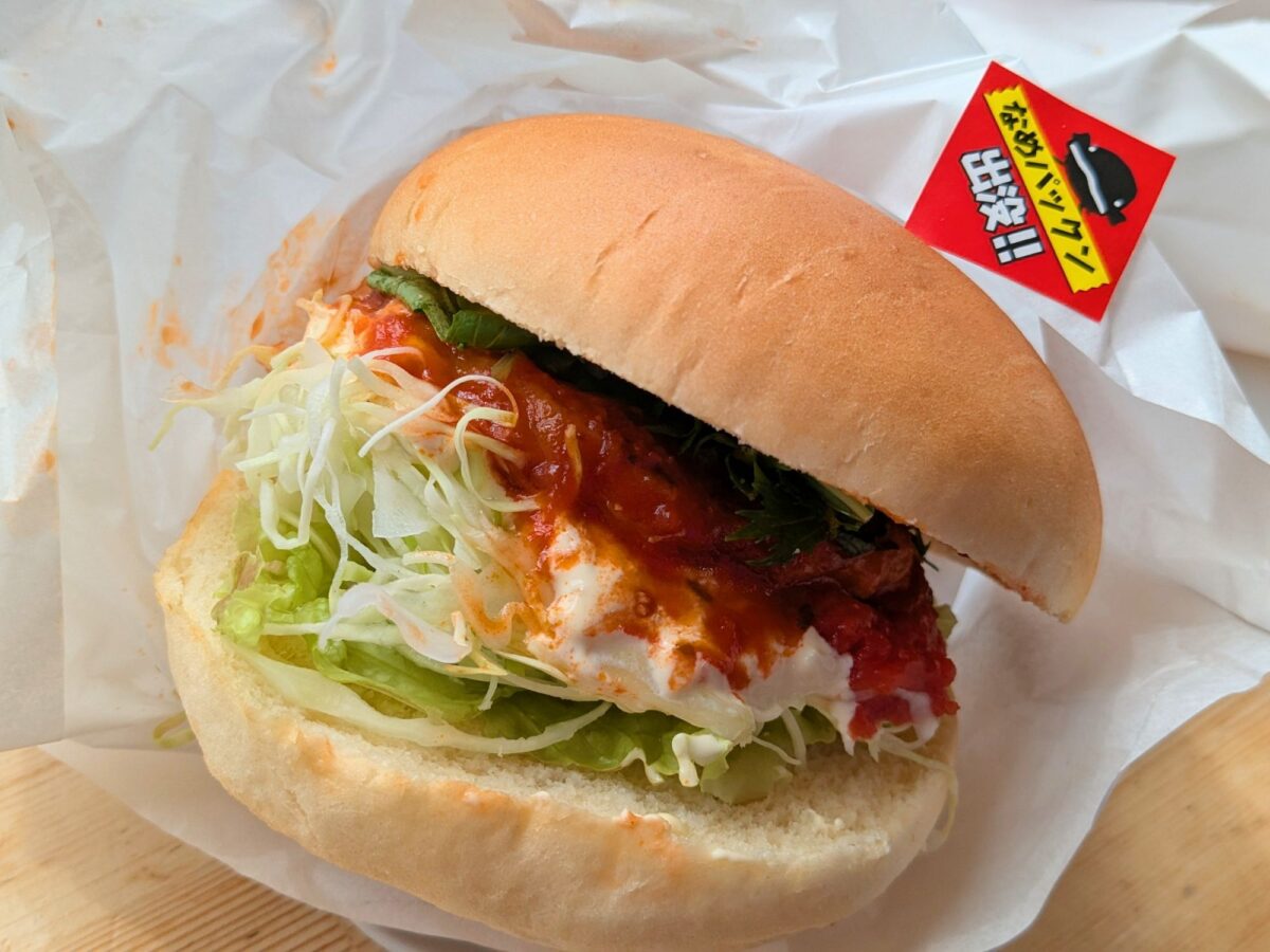こちらが行方バーガーの「なめパックン」。名前からはどんな食材なのか全く想像がつきませんが、その正体はナマズハンバーガー。霞ヶ浦産のナマズのカマ肉を使用したハンバーガーなのです。