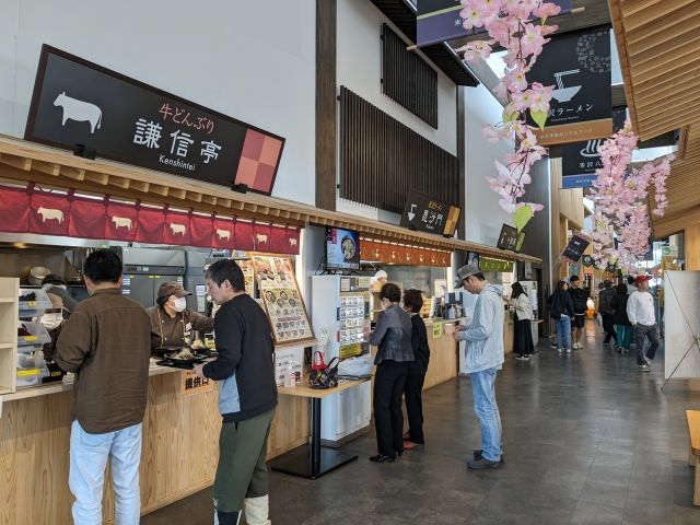 牛毘亭とは別にフードコートもあります。「蕎麦処十割庵」では米沢牛十割つけそば、「米沢ラーメン毘沙門」では米沢牛肉麺、「牛どんぶり謙信亭」では、米沢牛すき焼き重や米沢牛カルビ重など、各店舗それぞれ米沢牛メニューあり。牛毘亭よりも、もっとお手軽に米沢牛を楽しむことができます。