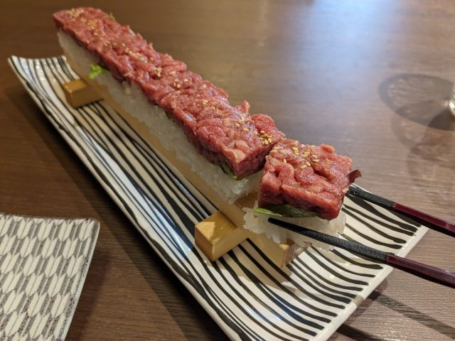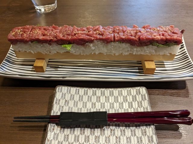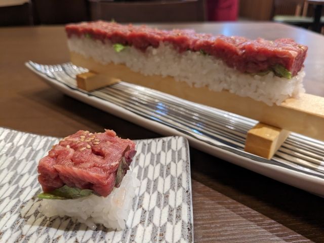 ということでハーフ押し寿司を選択。こちらもユッケ、ビビンバ、ローストビーフから選べますが、サイズ的にハーフ&ハーフは不可。おすすめっぽいユッケ寿司にしました。