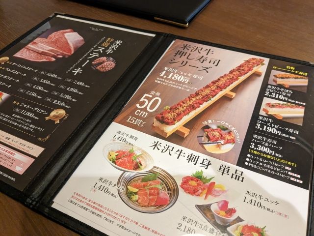 ここの名物は「米沢牛押し寿司」シリーズ。50cmにも及ぶロングな肉寿司は、インパクト抜群です。